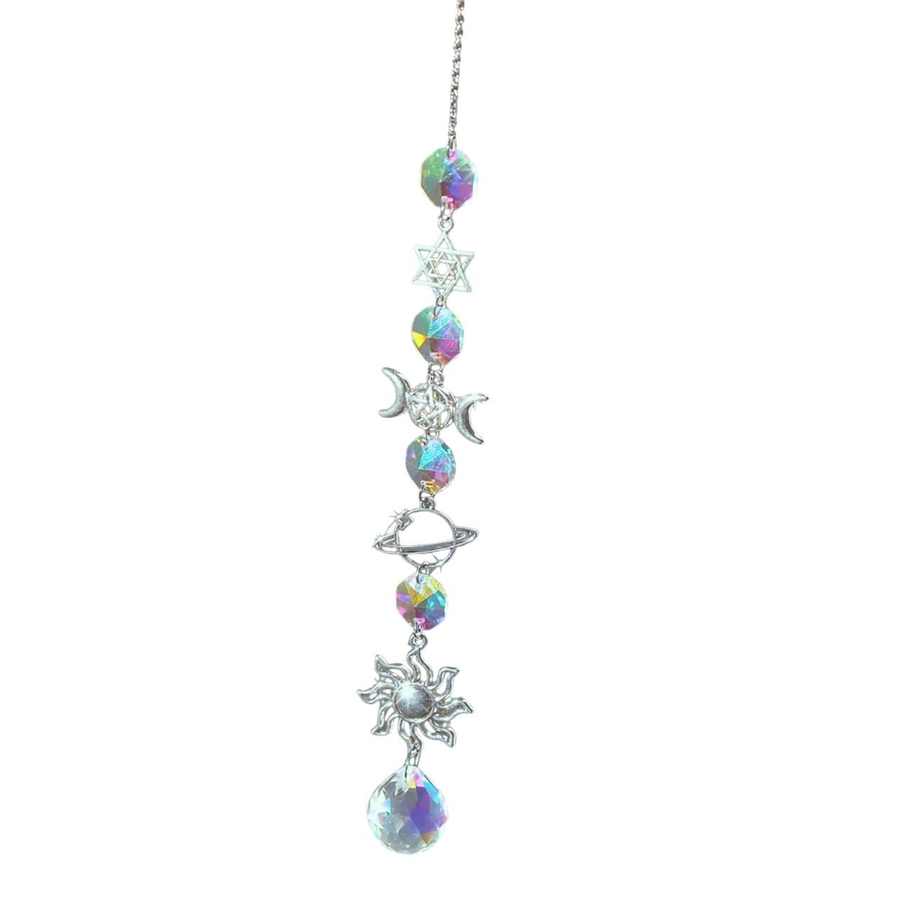 Hanging decoration with crystals and motifs of the moon, planet and sun creates rainbow effects. Great for the home or balcony. Full description