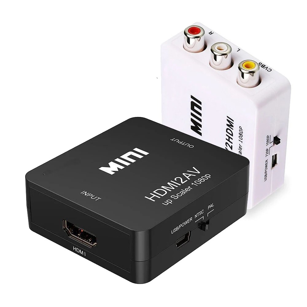 The HDMI to RCA AV converter allows you to connect modern devices to older televisions or projectors. USB powered, supports PAL/NTSC. Full description