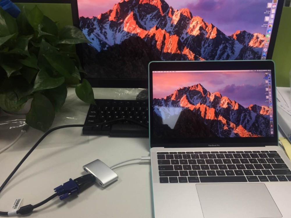 The adapter has 3 inputs: VGA, audio, and HDMI.
