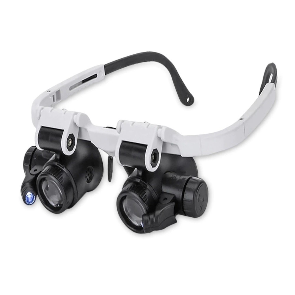 This head-mounted magnifier is a compact portable magnifier offering three levels of magnification. As it is secured in a glasses frame, your hands will be free, allowing you to carry out any work with small objects. For added convenience, there are two bright light sources on either side of the lens. The head-mounted magnifier is suitable for repairing various small items, watches and mobile phones.