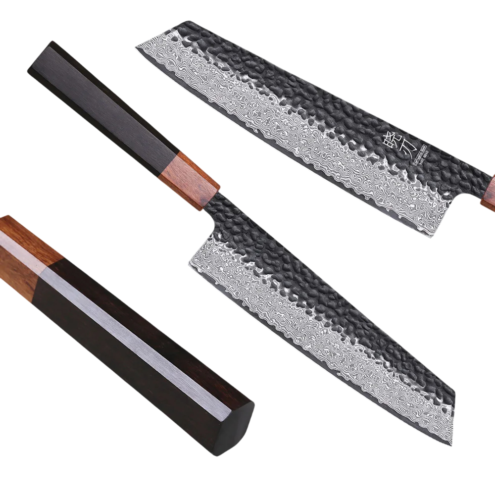 This knife will be appreciated by anyone who demands a precise tool with long-lasting durability and professional performance. VG10 steel offers exceptional sharpness and durability, while the Damascus pattern gives each piece a unique appearance. Thanks to its versatile shape, the Kiritsuke is ideal for cutting both meat and vegetables and fish, making it the perfect tool for everyday use. The hand-forged craftsmanship guarantees quality and uniqueness that machine production cannot offer. If you are looking for a luxurious and high-performance kitchen knife, the Kiritsuke is the right choice.