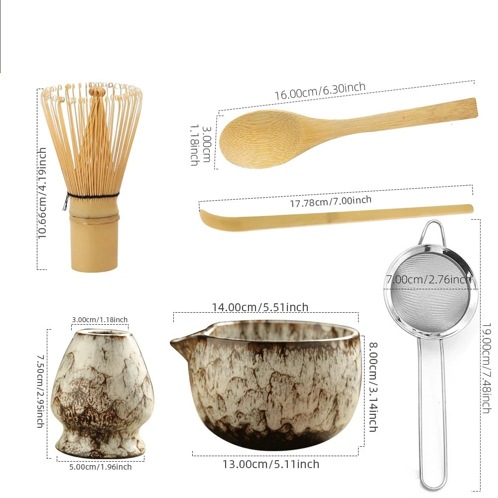 • Contents: 1 matcha whisk, 1 tea spoon, 1 thin spoon, 1 tea bowl, 1 ceramic whisk stand, 1 sieve for matcha tea