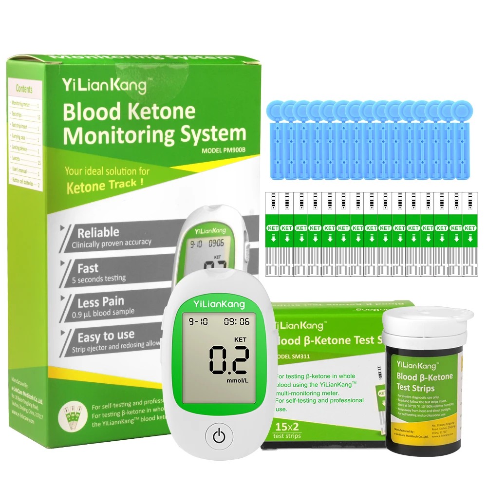 - Package contents: 1× ketone meter, 1× lancing device, 10× lancets, 15× test strips