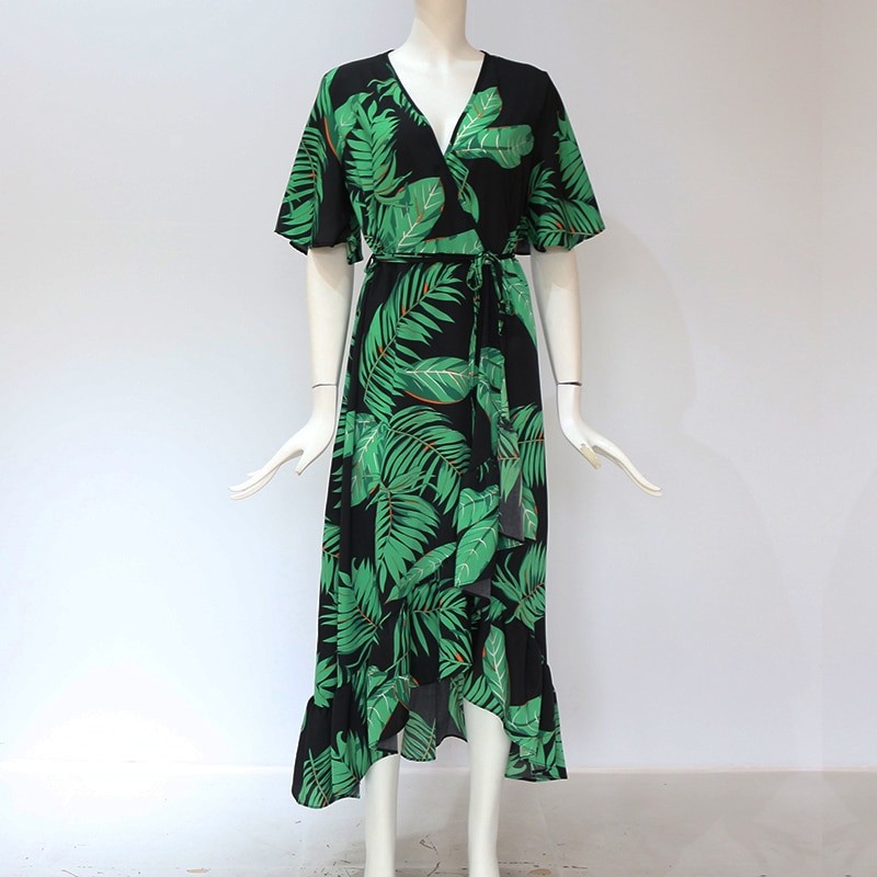 Summer women's dress with a large leaf print.