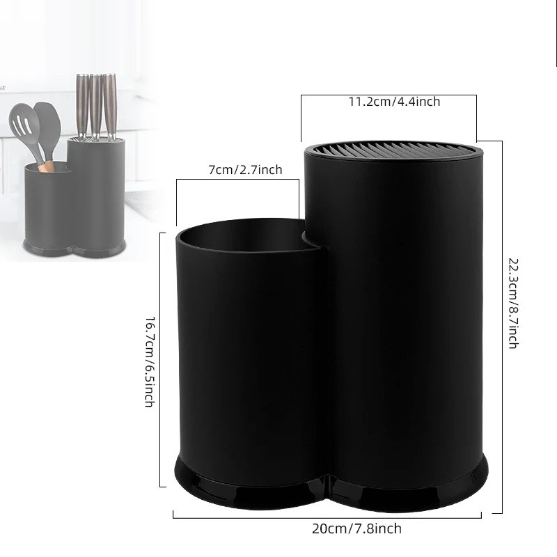 Do you need an efficient storage solution on your kitchen counter? This double hole knife and utensil stand provides a practical solution for everyday cooking. The round opening with a diameter of 11.2 cm is ideal for knives, while the smaller section with a diameter of 7 cm is perfect for spoons, whisks, and other tools.