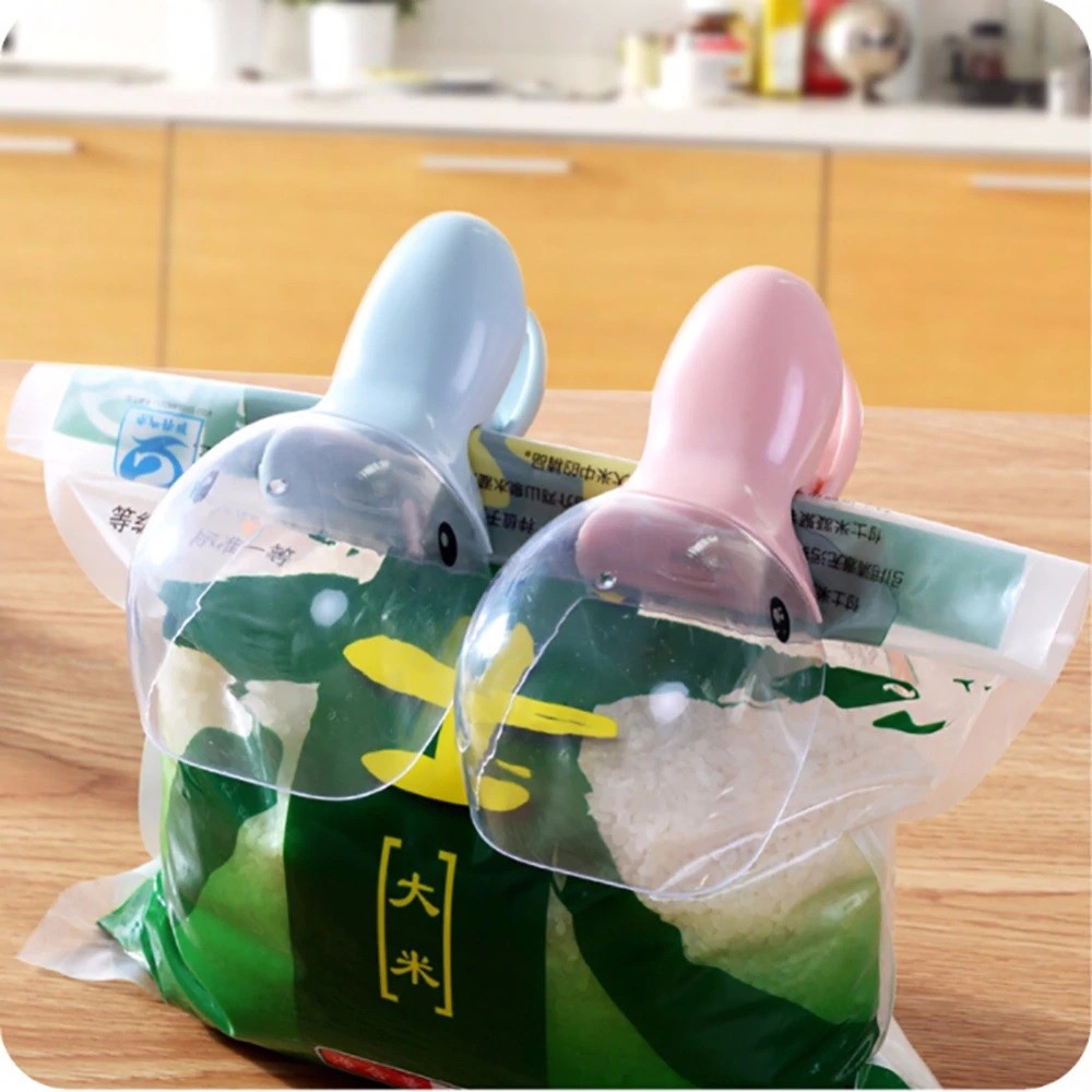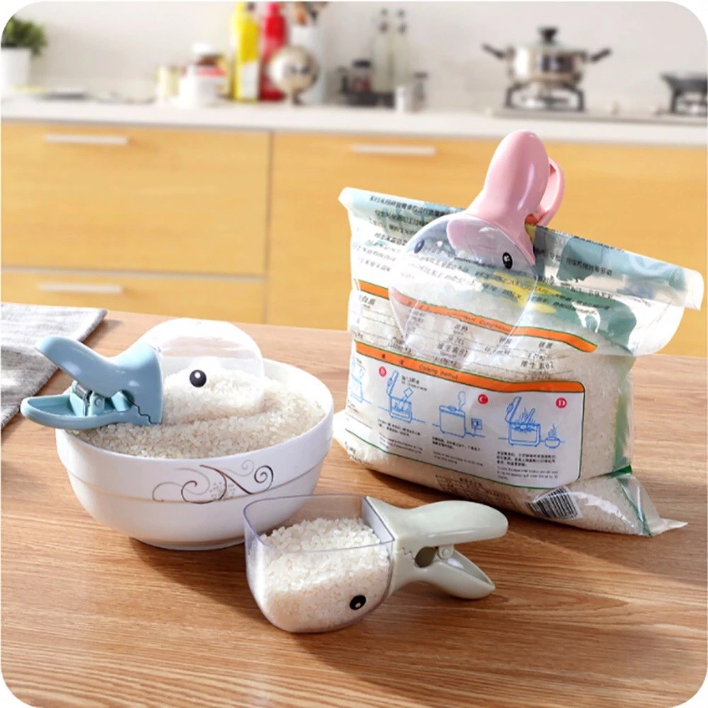 The scoop has a clip at the handle, so you can close a bag of rice, for example.