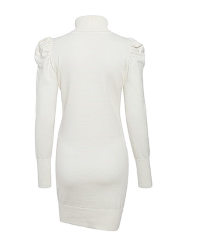 Women's knitted dress with long sleeves and a roll neck.