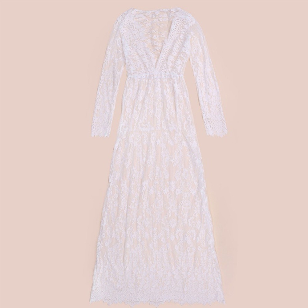 Long lace maxi dress with long sleeves and a deep neckline.