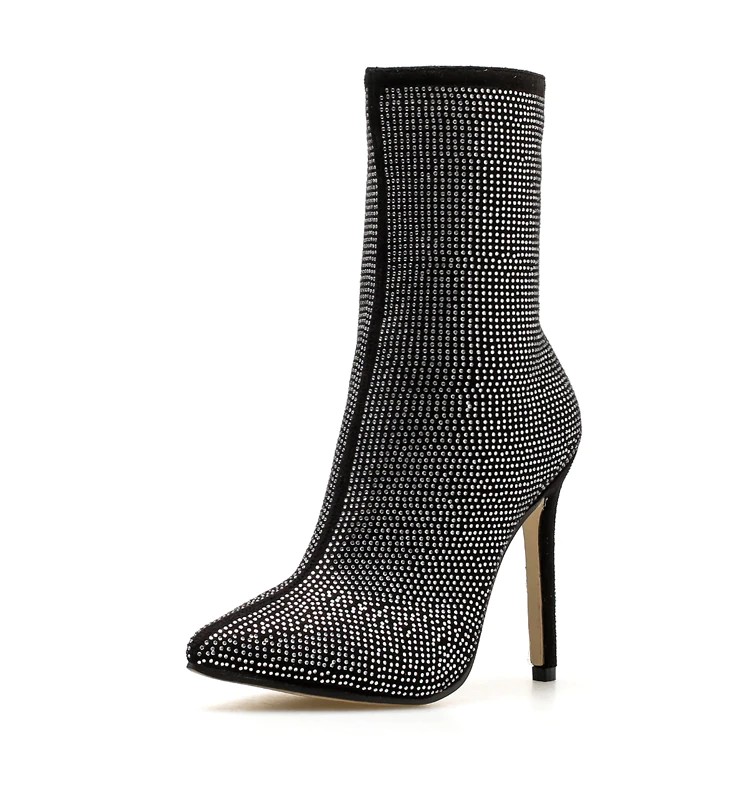 You will love these modern high-heeled ankle boots with silver rhinestones.