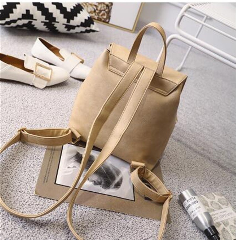 An elegant single-compartment backpack fastened with straps featuring a metal clasp and a flap with two straps.