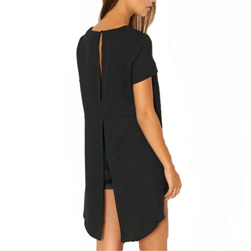 Black blouse with short sleeves and a longer back.
