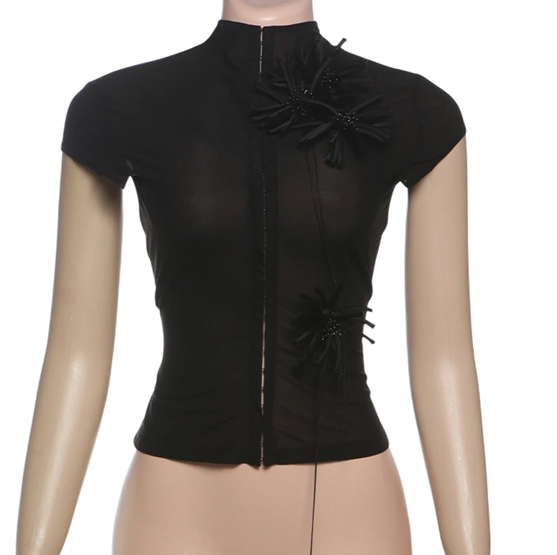 This ladies' black blouse is a striking fashion piece that catches the eye at first glance with its original design. The semi-transparent fabric adds lightness and sensuality to the outfit, while the decorative 3D flowers create an elegant and luxurious appearance. The short sleeves ensure comfort even during extended wear, making the blouse particularly suitable for warmer days or indoor social events. The black colour is timeless and easily combines with other wardrobe pieces. This model is an ideal choice for women who want to stand out while maintaining elegance.