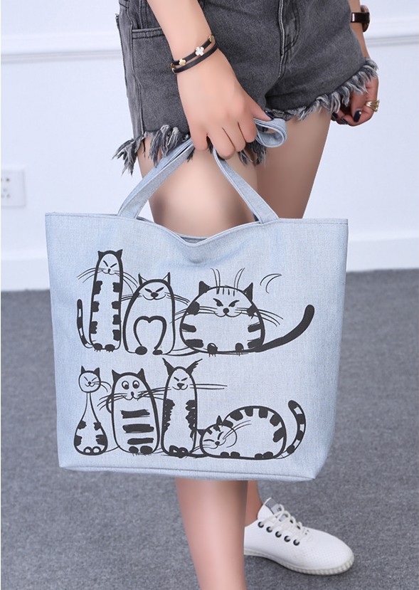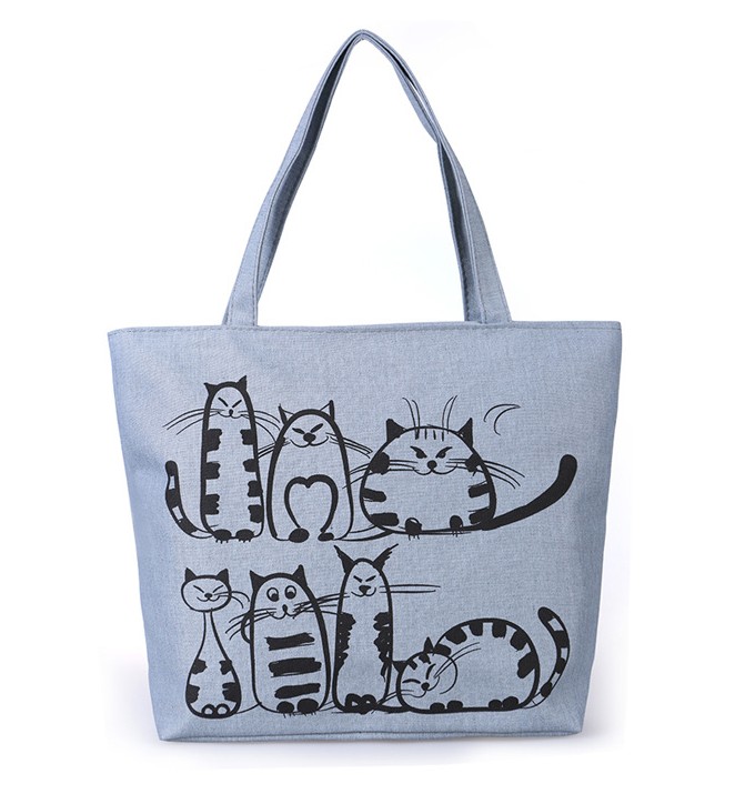 The bag featuring cat images serves as an interesting addition.