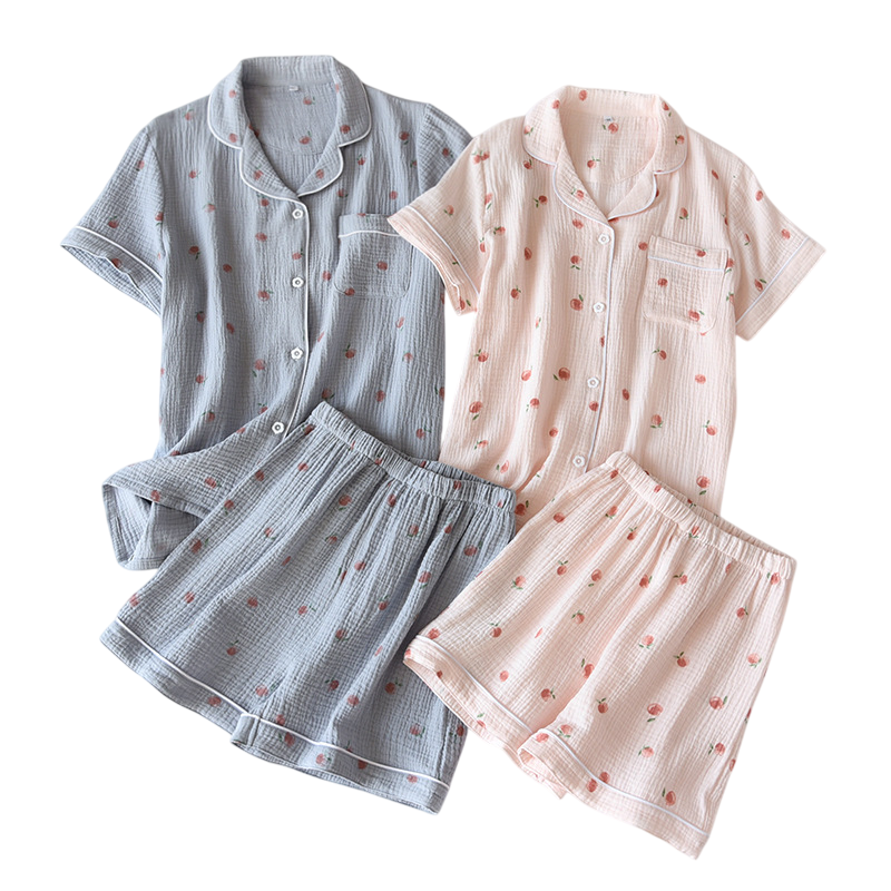 Home page Home page Clothing & Accessories Women’s Clothing Women’s Nightwear Women’s Pyjamas Ladies' Cotton Pyjama Set with Short Sleeves and Collar Solid Colour Set with Peach Motif Button-Up Shirt and Shorts with Pocket
