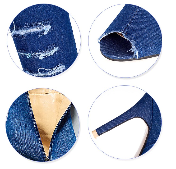 There are no limits to imagination, which is why we offer you these denim knee-high boots with holes.