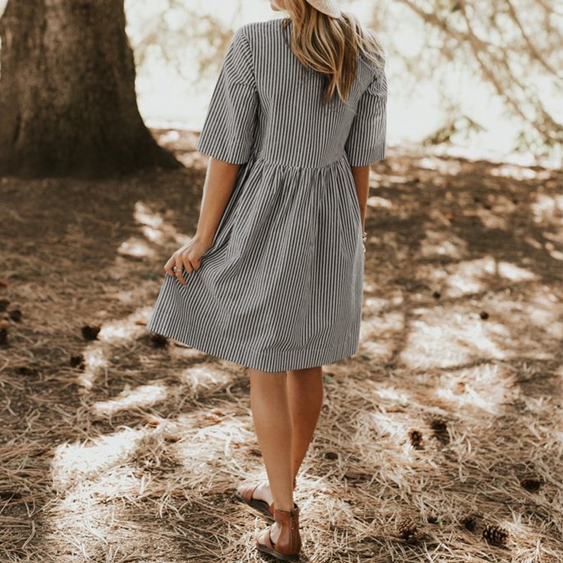 Ladies' dress with short sleeves and pockets.