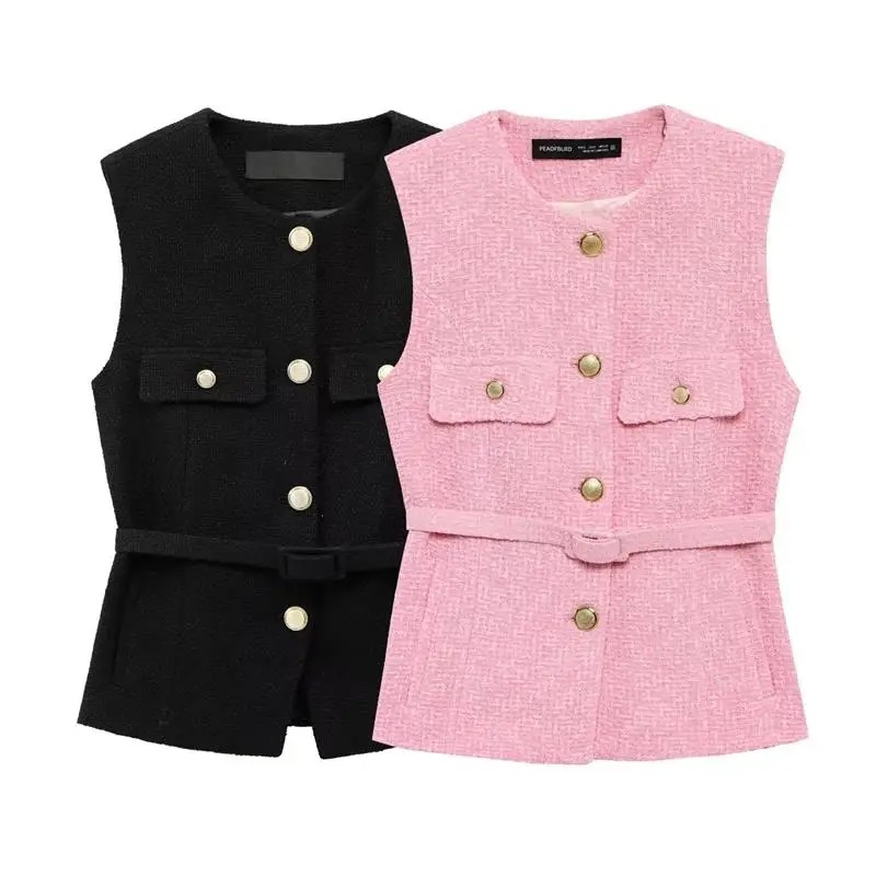 Ladies' Elegant Plain Waistcoat with Belt and Chest Pockets Stylish Waistcoat with O-Neck Button Fastening Available in Various Colours