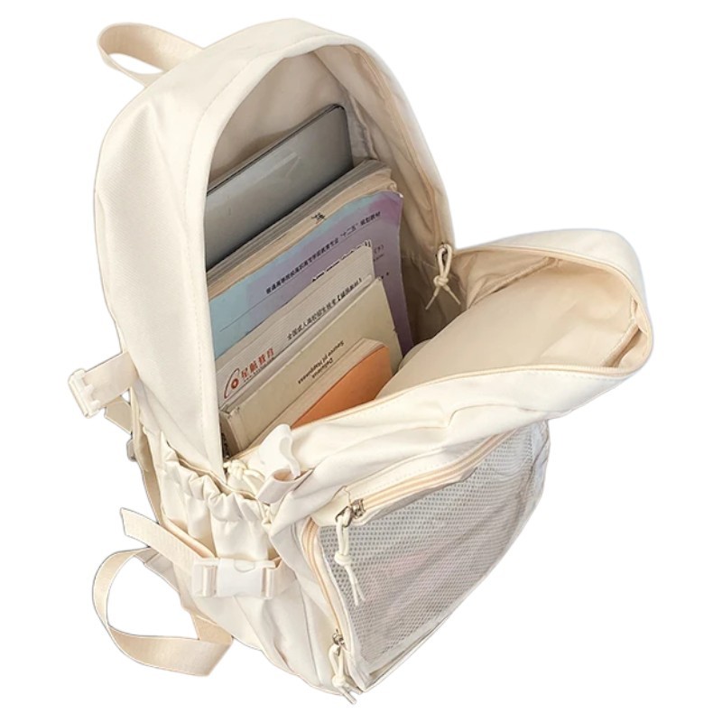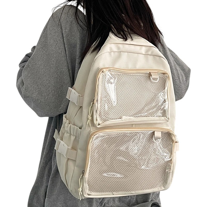 The backpack is a great choice for women looking for a practical accessory with a modern design. With a combination of transparent and classic pockets, it offers ample space for textbooks, notebooks, personal items, and small electronics. The adjustable straps allow for adaptation to different body types and ensure comfort even during prolonged wear. The side buckles help maintain the backpack's stable shape while allowing for volume regulation. This ladies' backpack easily matches both urban and sporty outfits and will become a reliable companion for every day.