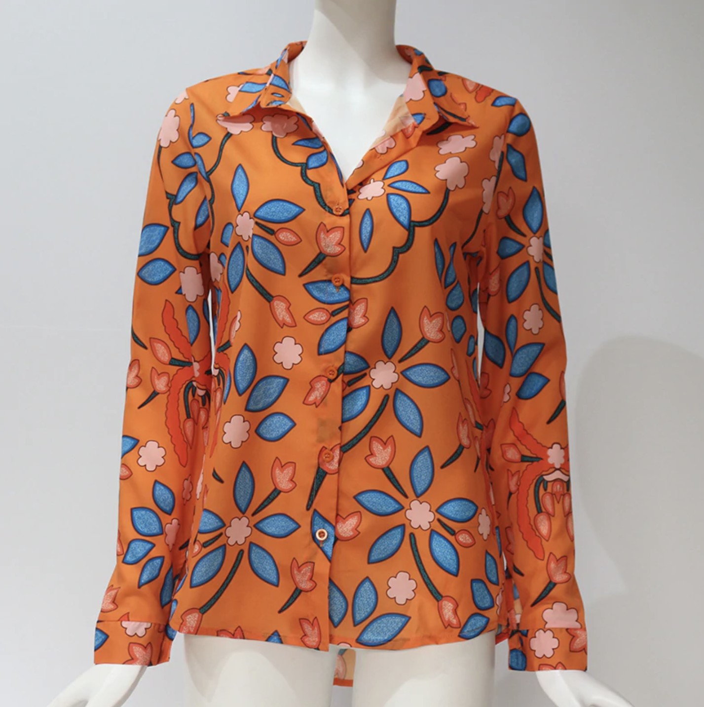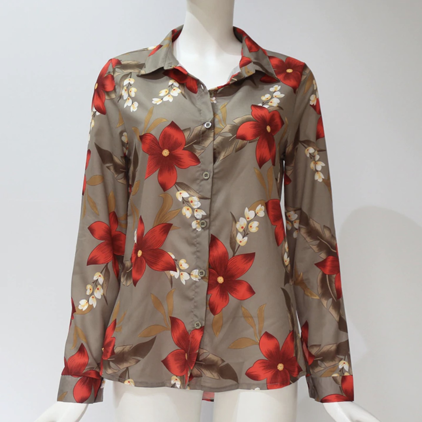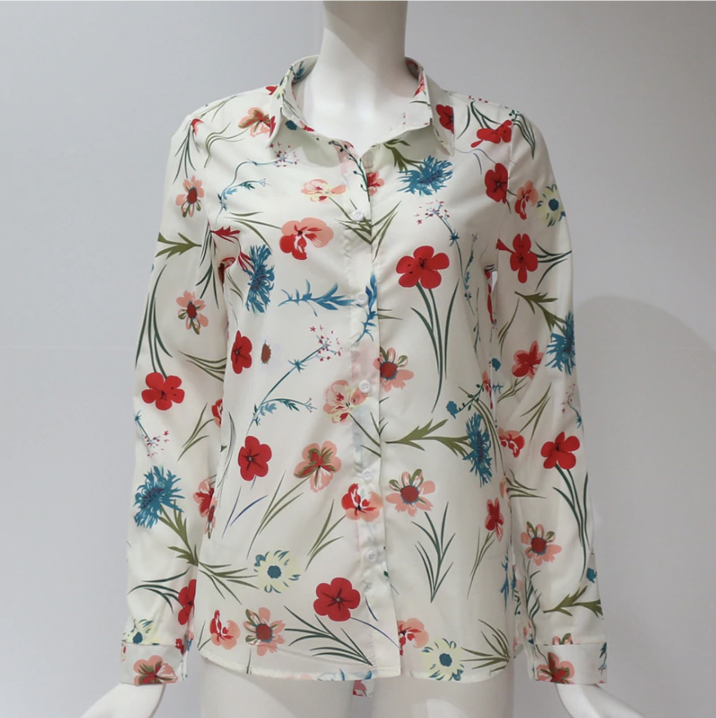 Ladies' shirt with a floral print. The shirt has long sleeves.