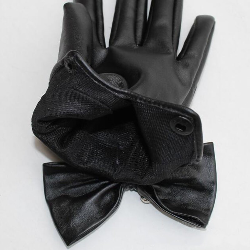 Very stylish ladies' gloves made of faux leather, adorned with a large bow and studs.