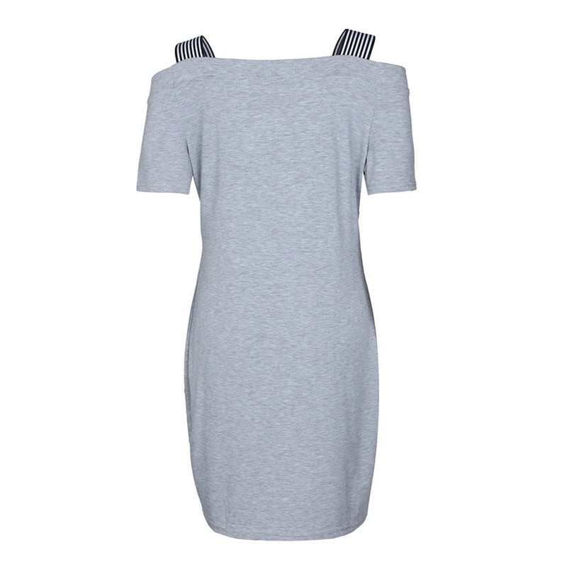 Ladies' grey mini dress with a wide neckline and contrasting straps.