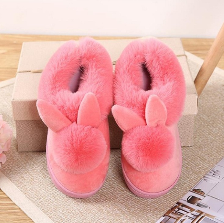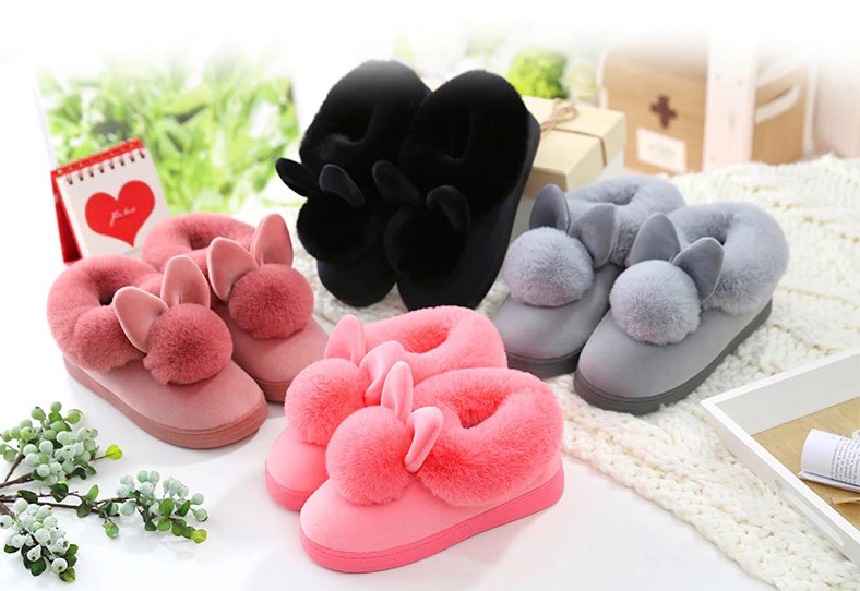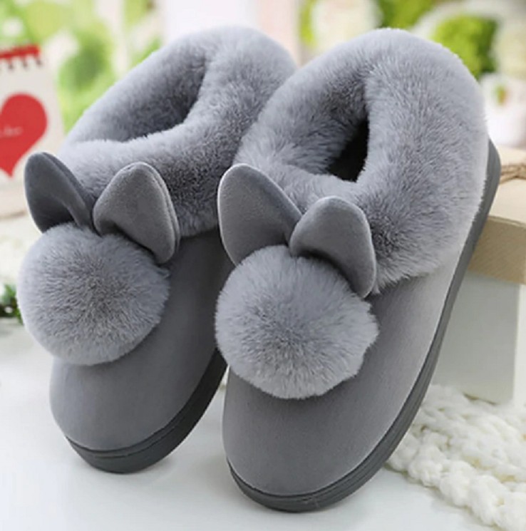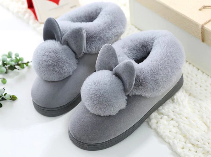 These slippers with pom-poms and bunny ears are very cute.