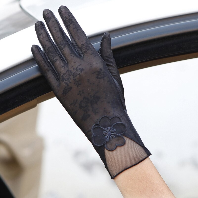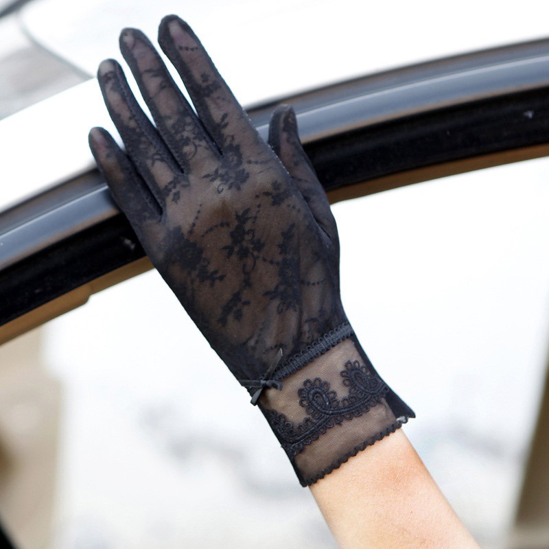 Elegant ladies' gloves made from sheer material adorned with lace.