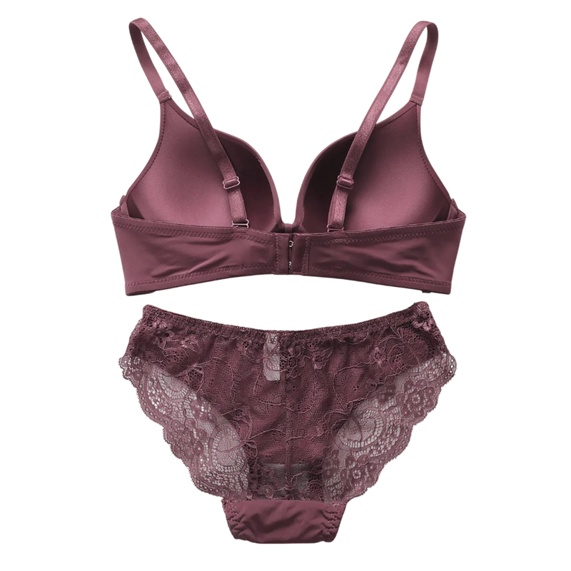 This ladies' lingerie set combines smooth and lace elements in one whole. The bra is primarily made of smooth material, while the knickers are complemented by lace on the sides. The overall effect is balanced and designed for everyday wear. Thanks to the materials used, the set adapts to the body's shape and allows for comfortable wear. The burgundy colour gives the set a striking appearance.