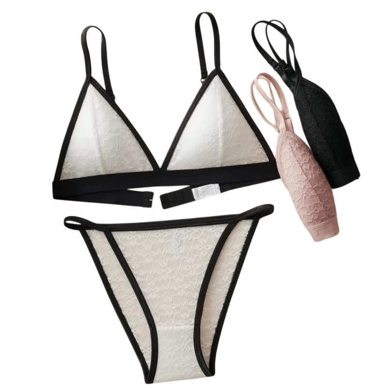 This model is suitable for women looking for a simple and comfortable option for lingerie. Thanks to the elastic material, it adapts well to the body and allows for comfortable wear throughout the day. The lace pattern gives the set a delicate appearance without prominent features. The unified design of the bra and briefs creates a cohesive look. The set is suitable for everyday wear and regular use.