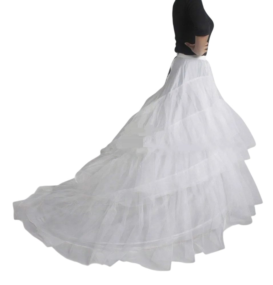This ladies' petticoat with long layered ruffles is the perfect choice for creating rich and naturally flowing volume for wedding and ball gowns. Thanks to its multi-layered construction, it provides elegant movement and a romantic look without the use of rigid hoops. The underskirt helps the dress maintain a beautiful silhouette while remaining light and airy. It is particularly suitable for princess, boho, and formal dress styles. The delicate tulle material ensures comfort throughout the day.