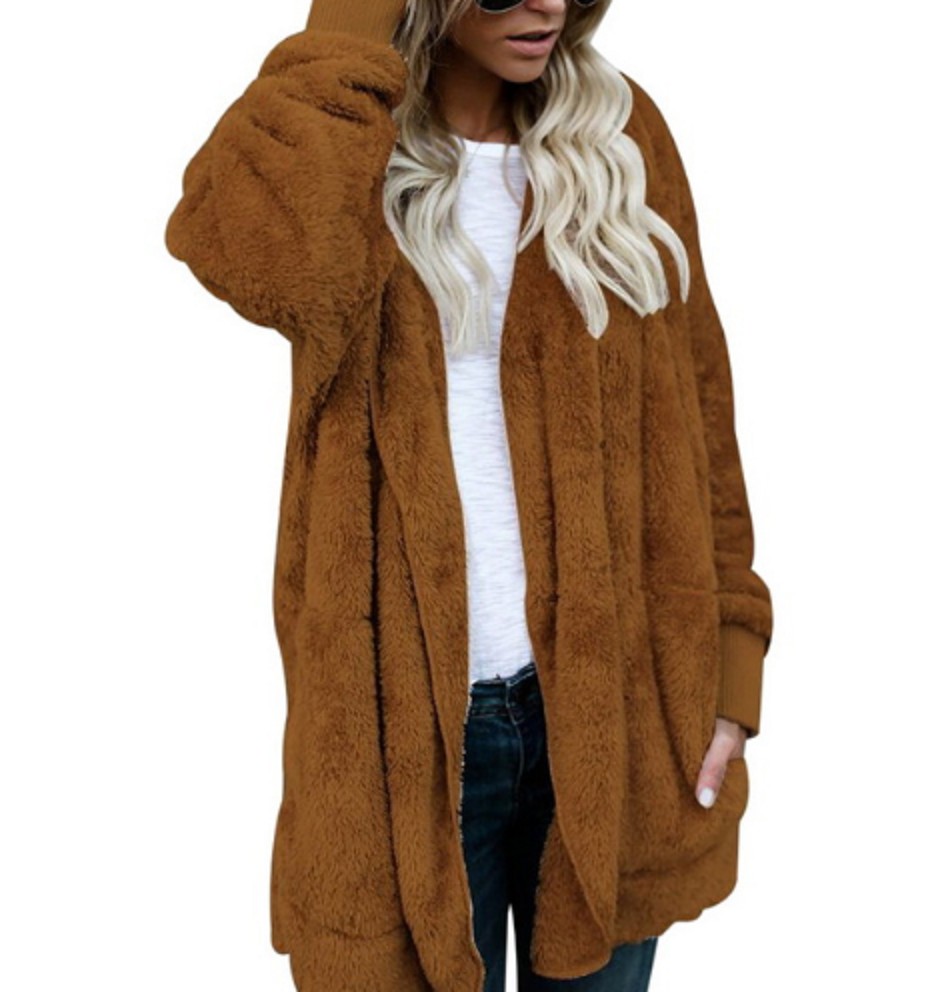 The jacket has a loose fit and does not fasten, featuring a hood and also pockets.