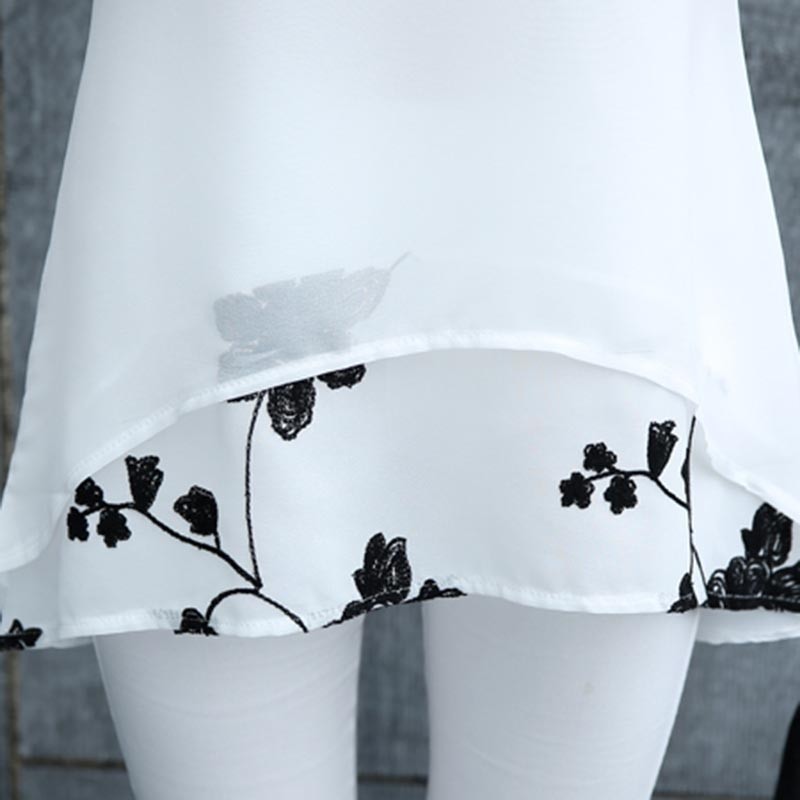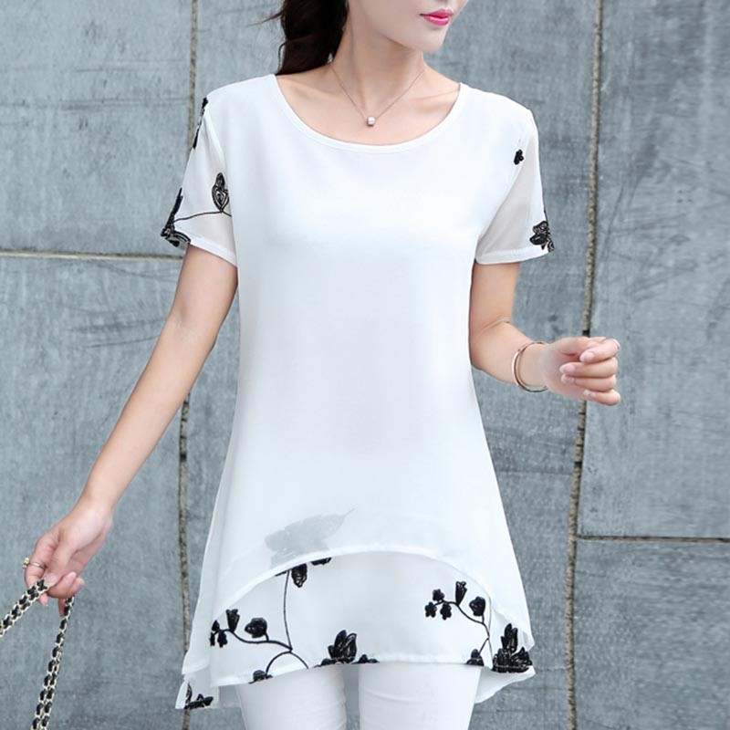 The blouse is longer, has short sleeves, and features a floral print on the lower side.
