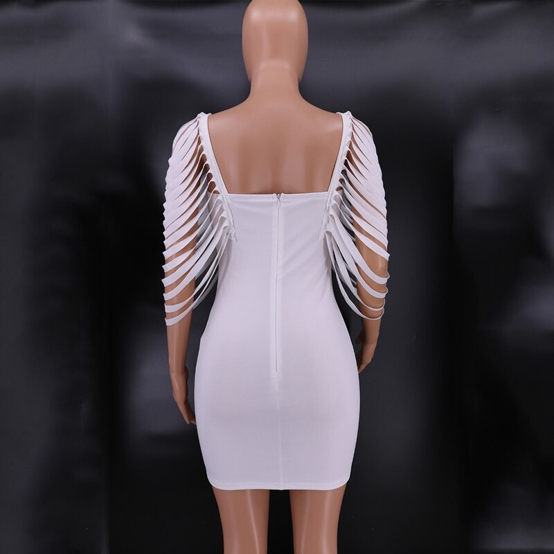 Ladies' luxury fitted dress to the knee with uniquely designed sleeves.
