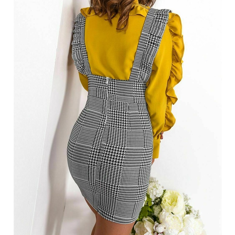 Unique mini dress with a high waist and long straps.