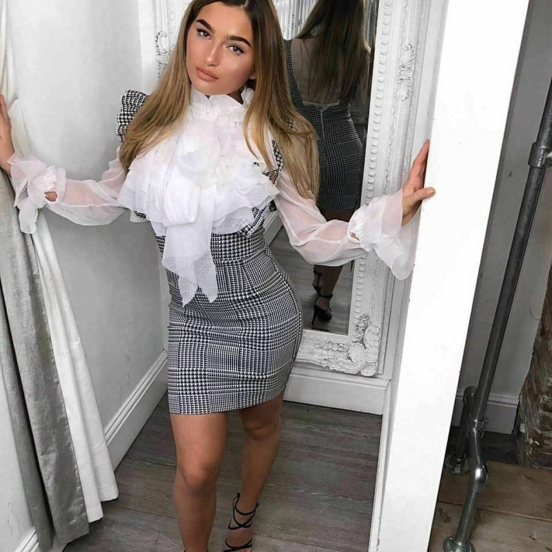 Smooth line of the skirt. The straps are adorned with ruffles.