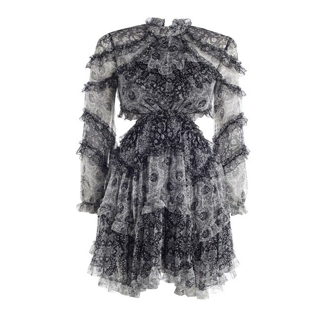 Airy dress with long sleeves and an impressively designed bodice.