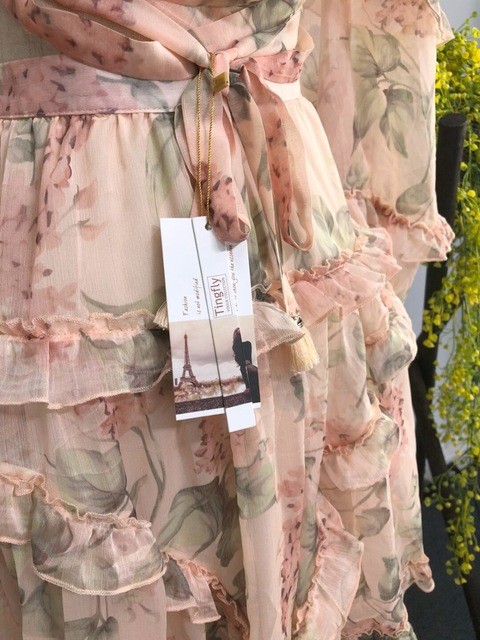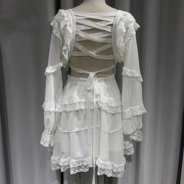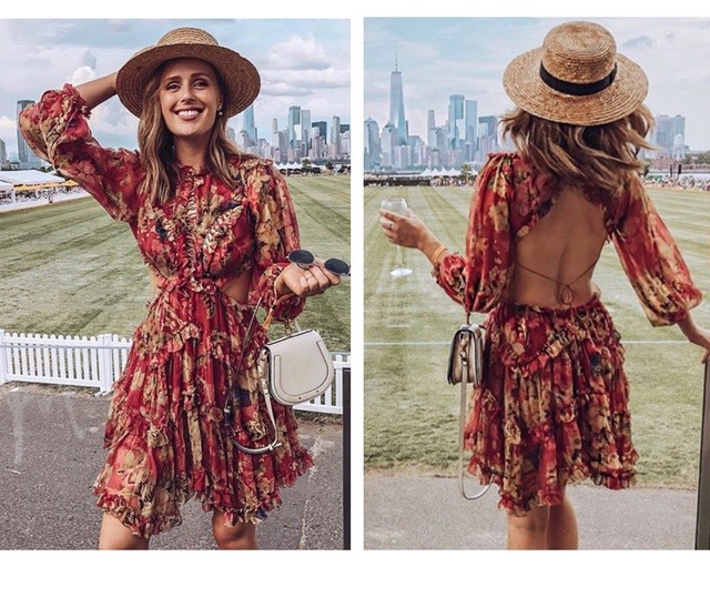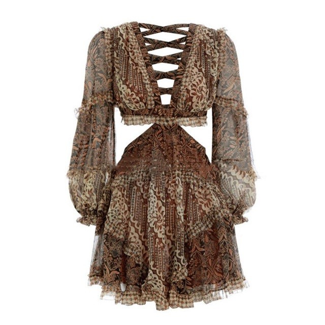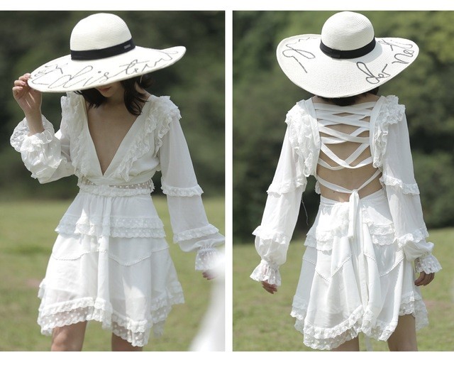 Exposed back and deep neckline give this enchanting boho-style dress a touch of sex appeal.