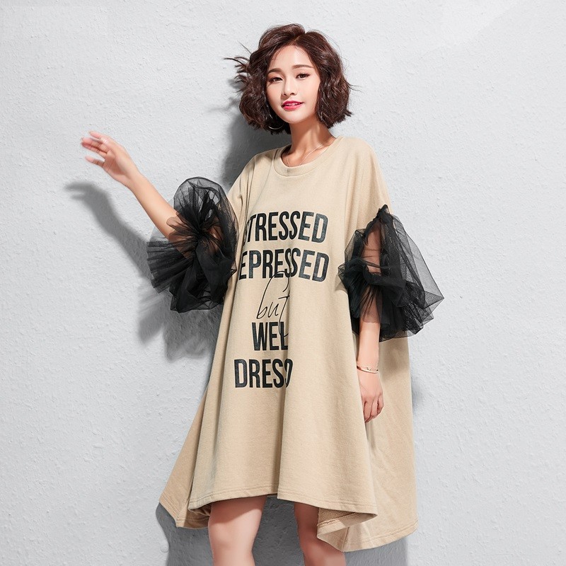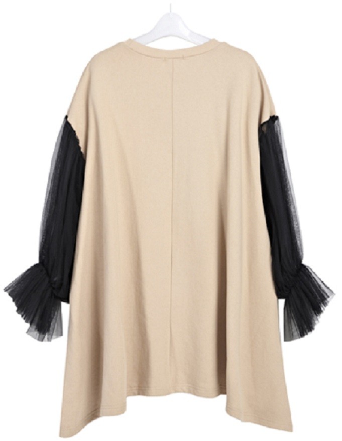 Stylish ladies' oversized dress with sheer tulle sleeves.