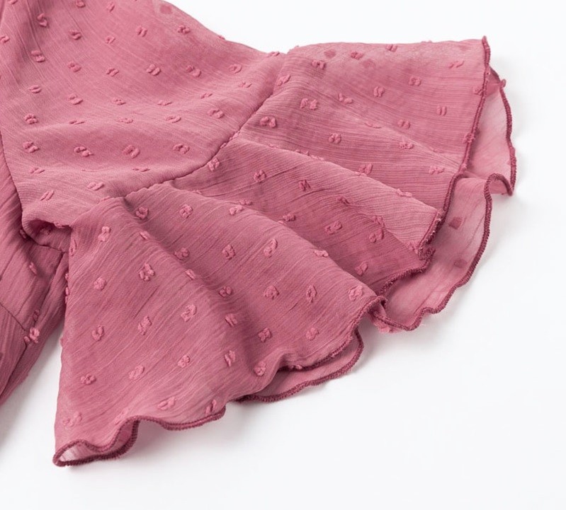 Delicate ladies' dress with ruffles and a subtle polka dot pattern.