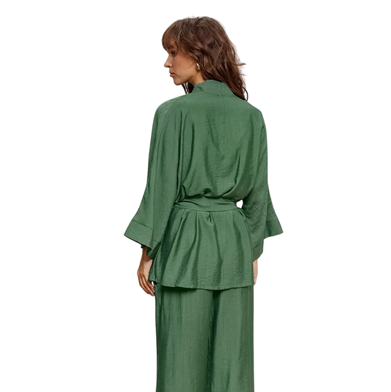 This ladies' pyjama set in elegant green is the perfect combination of comfort, style, and practicality. Made from a pleasant blend of cotton and nylon, it offers softness, breathability, and a subtle sheen, making it ideal for cooler evenings and comfortable relaxation at home. The pyjama consists of a robe-style top with long sleeves, which ties with a fabric cord, and matching loose-fitting trousers. This design exudes a relaxed yet feminine vibe – perfect for women who appreciate elegance even in a home setting.