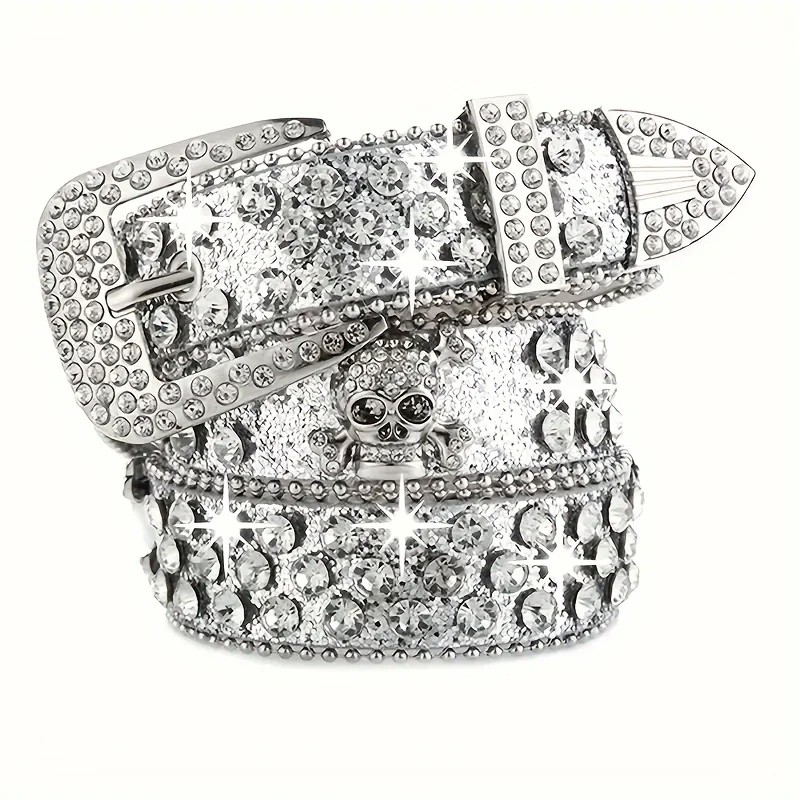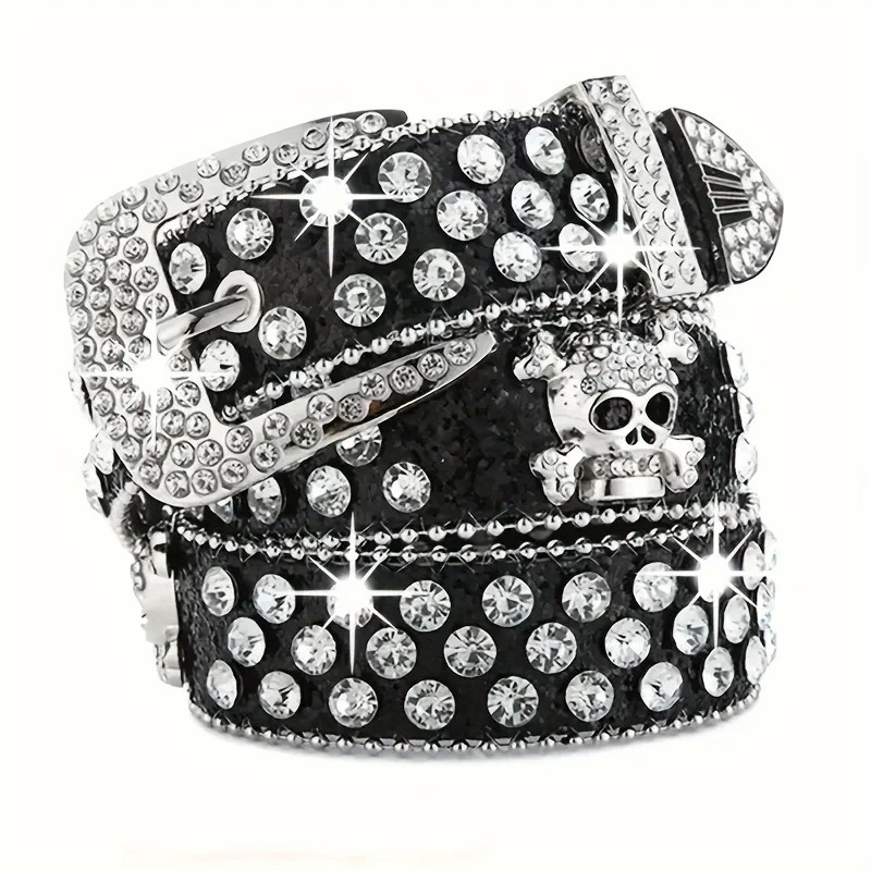 Ladies' Rock Belt with Skull and Gemstones PU Leather 110 cm Stylish Belt with Metal Skull Shiny Stones Fashion Accessory Punk Goth Style