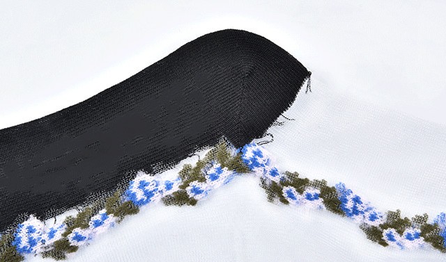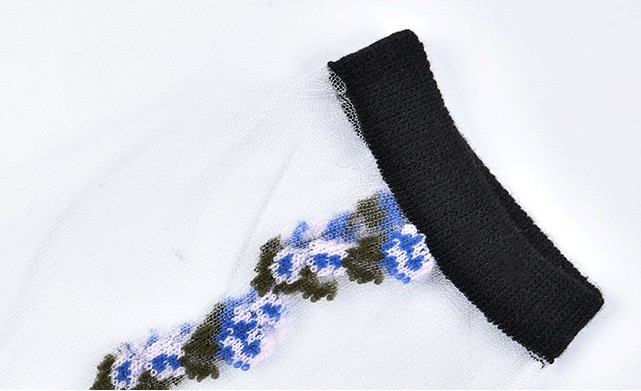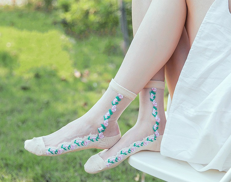 Sheer socks are adorned with delicate flowers.