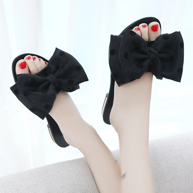 These beautiful slippers with a bow and dots are very cute and comfortable.