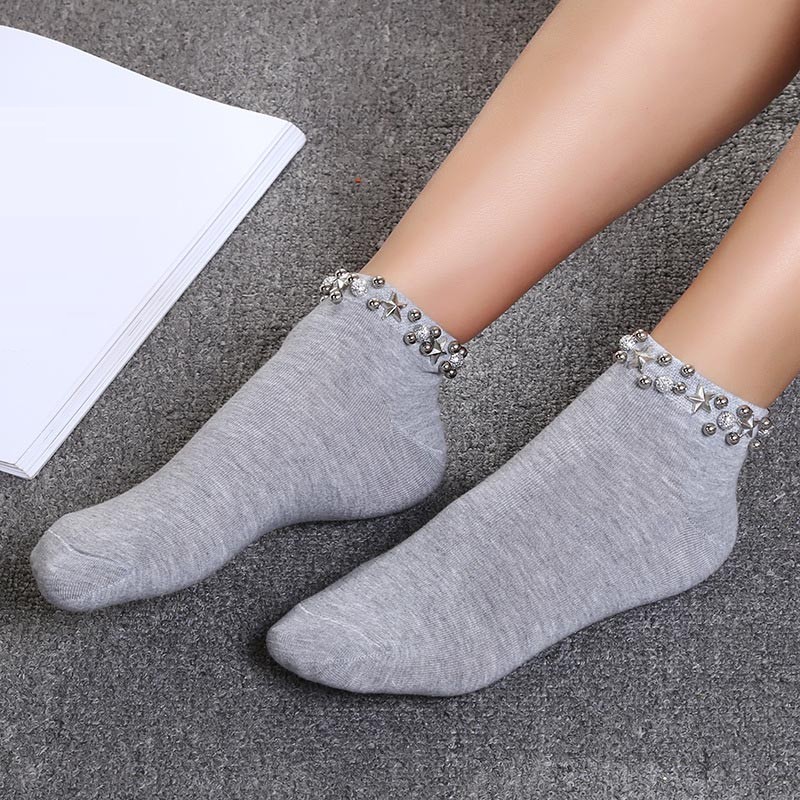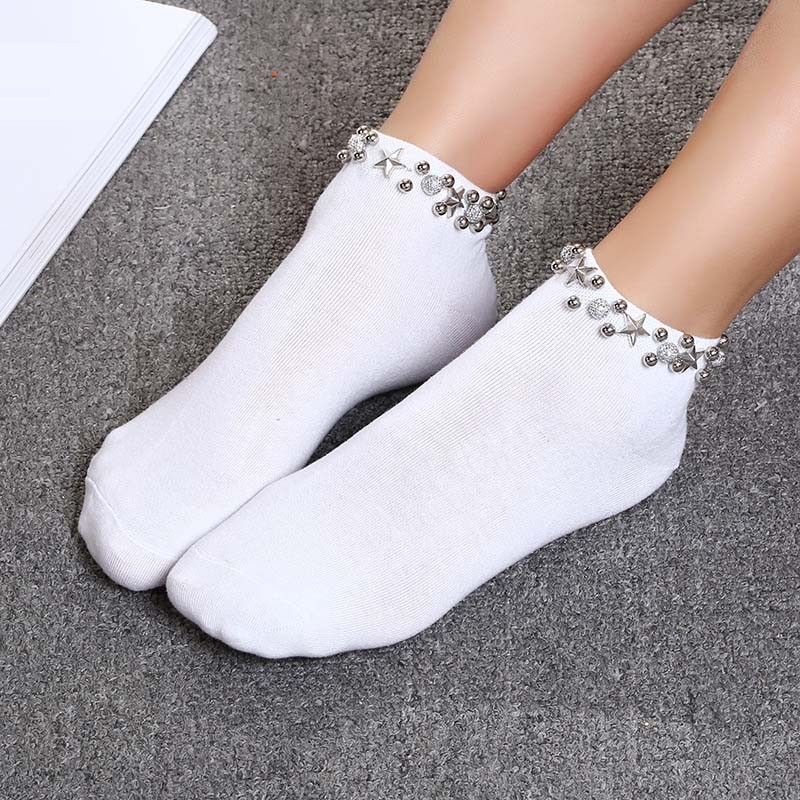 The socks are adorned with silver stars and beads.