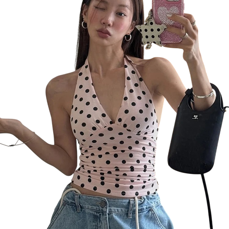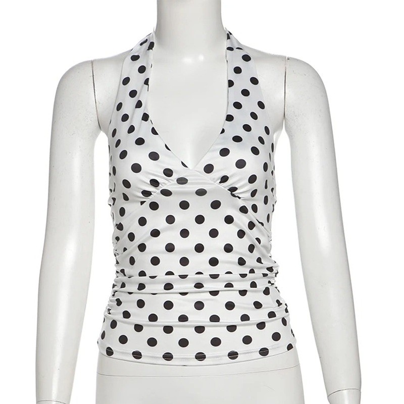 The top is an ideal choice for women looking for an original yet versatile piece for their wardrobe. The polka dot pattern adds lightness and a unique style to the outfit. The wide straps around the neck ensure comfort and stability even during prolonged wear. Thanks to its timeless cut, the top can be easily combined for both casual and elegant occasions. If you want a stylish top that is comfortable yet eye-catching, this ladies' top is a great choice.