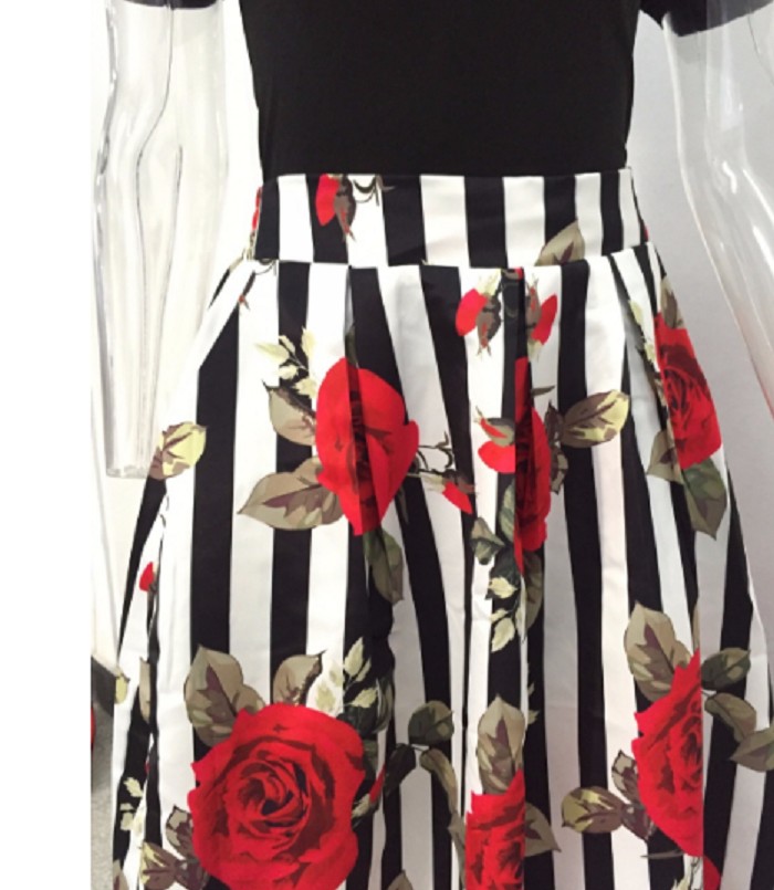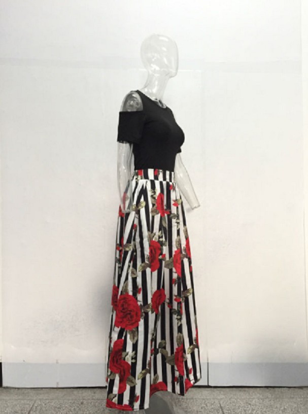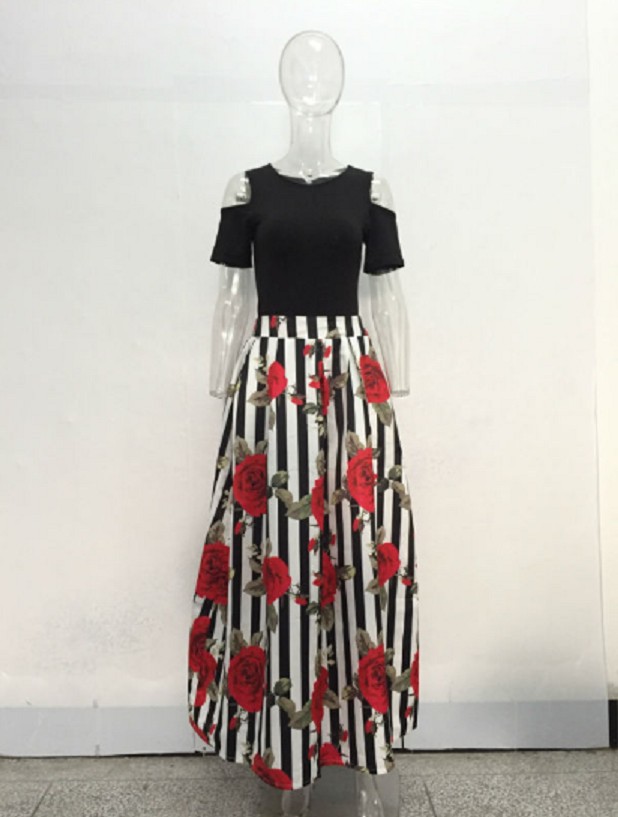 The first is a black top with shoulder cut-outs and the second is a long floral skirt.