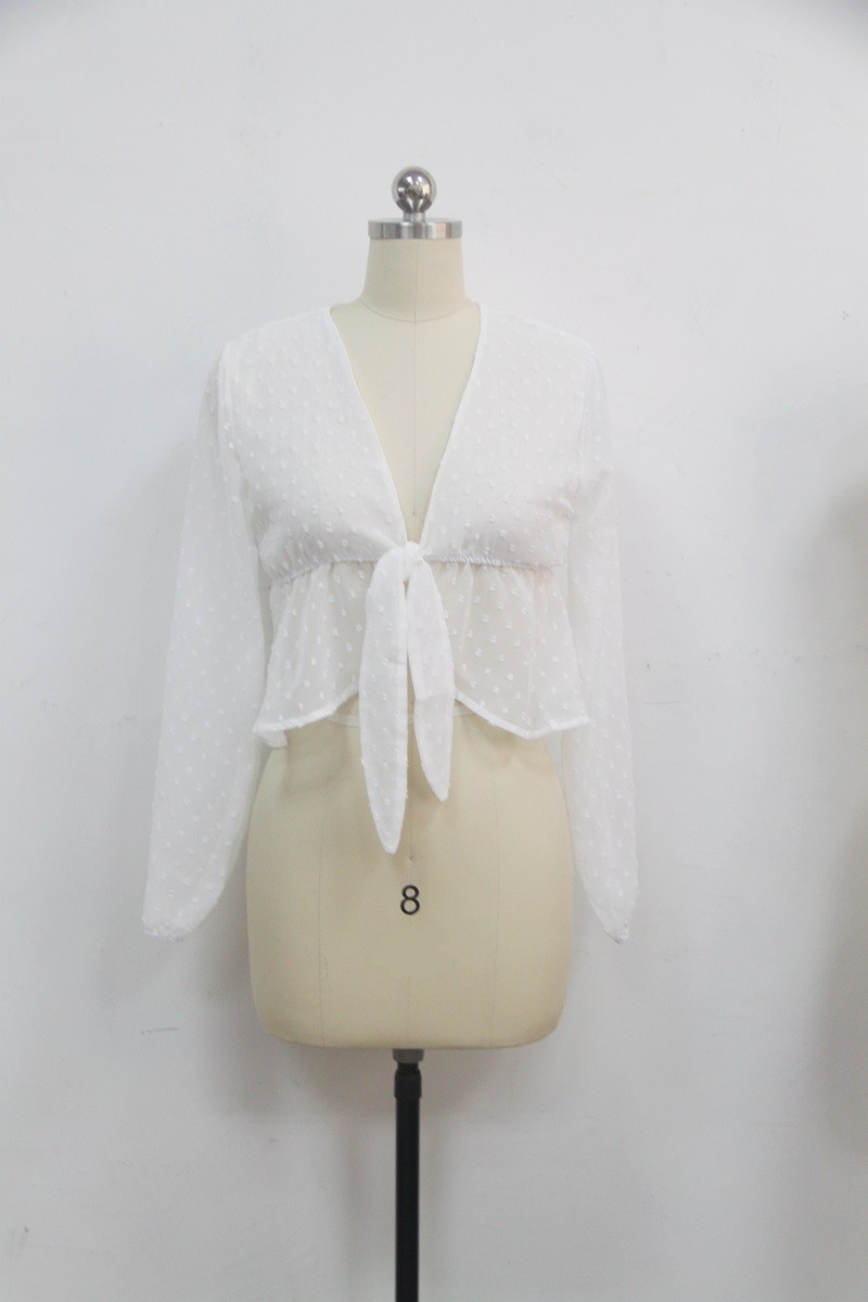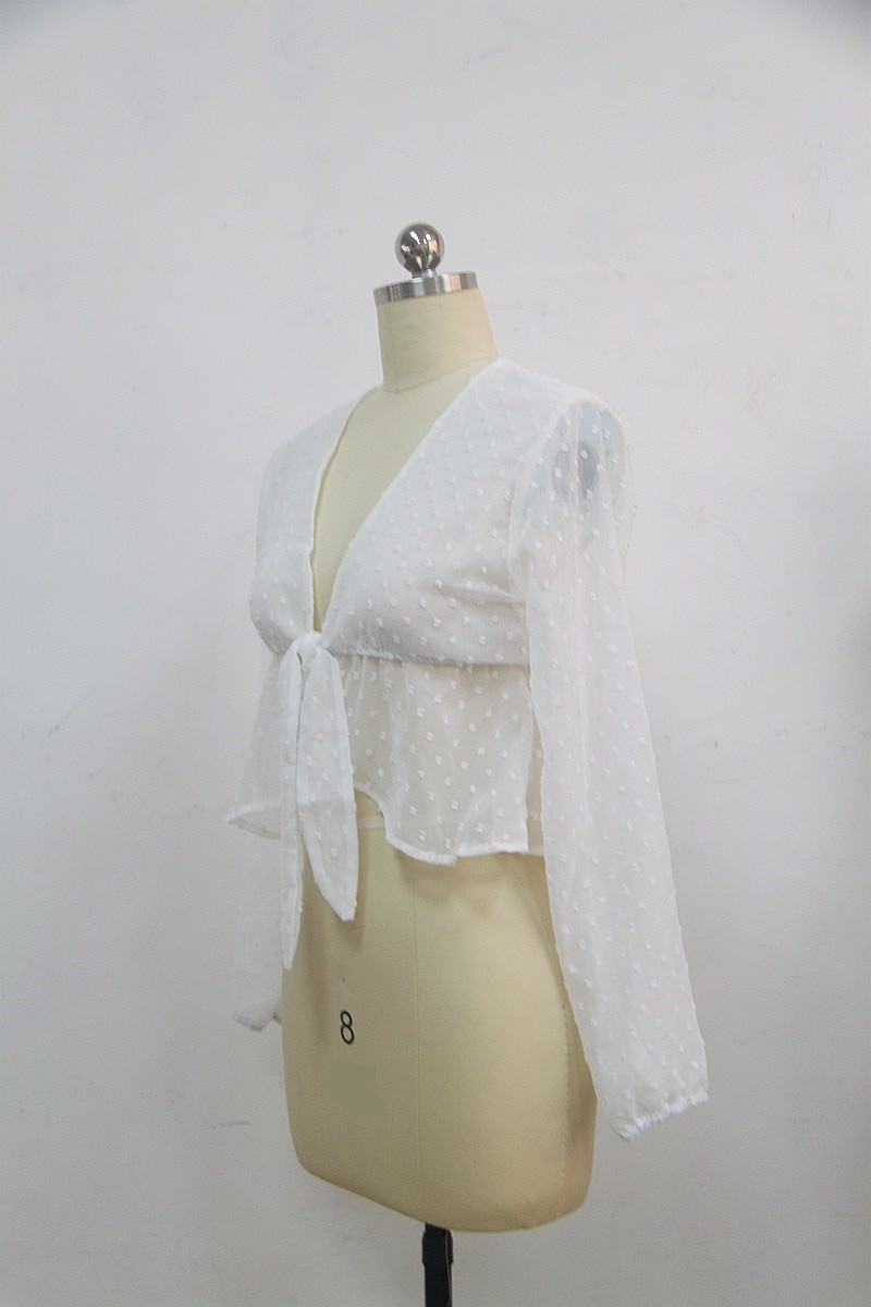 It features a deeper neckline that transitions into a knot and is slightly sheer.