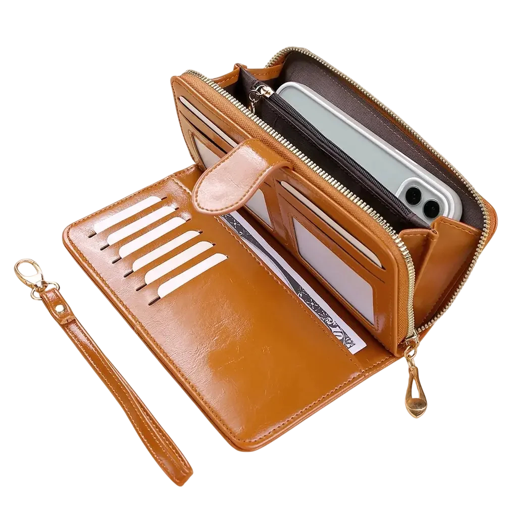 Practical ladies' wallet with a fold-out design, zip closure, and large capacity, complemented by a wrist strap for comfortable carrying. Full description