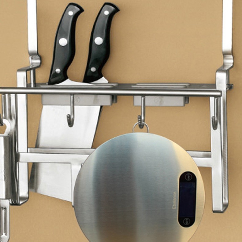 The stainless steel kitchen scale features a slim design with a hanging hook for easy storage in a hanging rack.