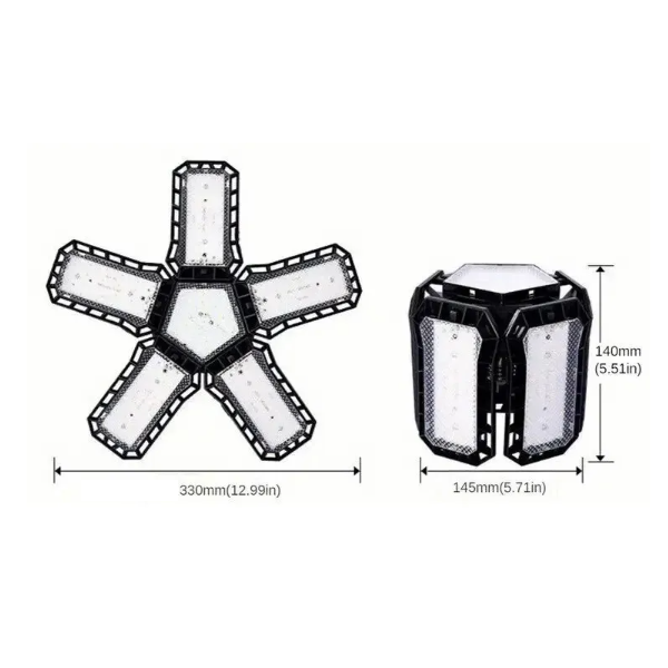 Powerful 80W LED lamp with five folding panels and E27 socket provides sharp cool white light for workshops, garages, and commercial spaces. Full description